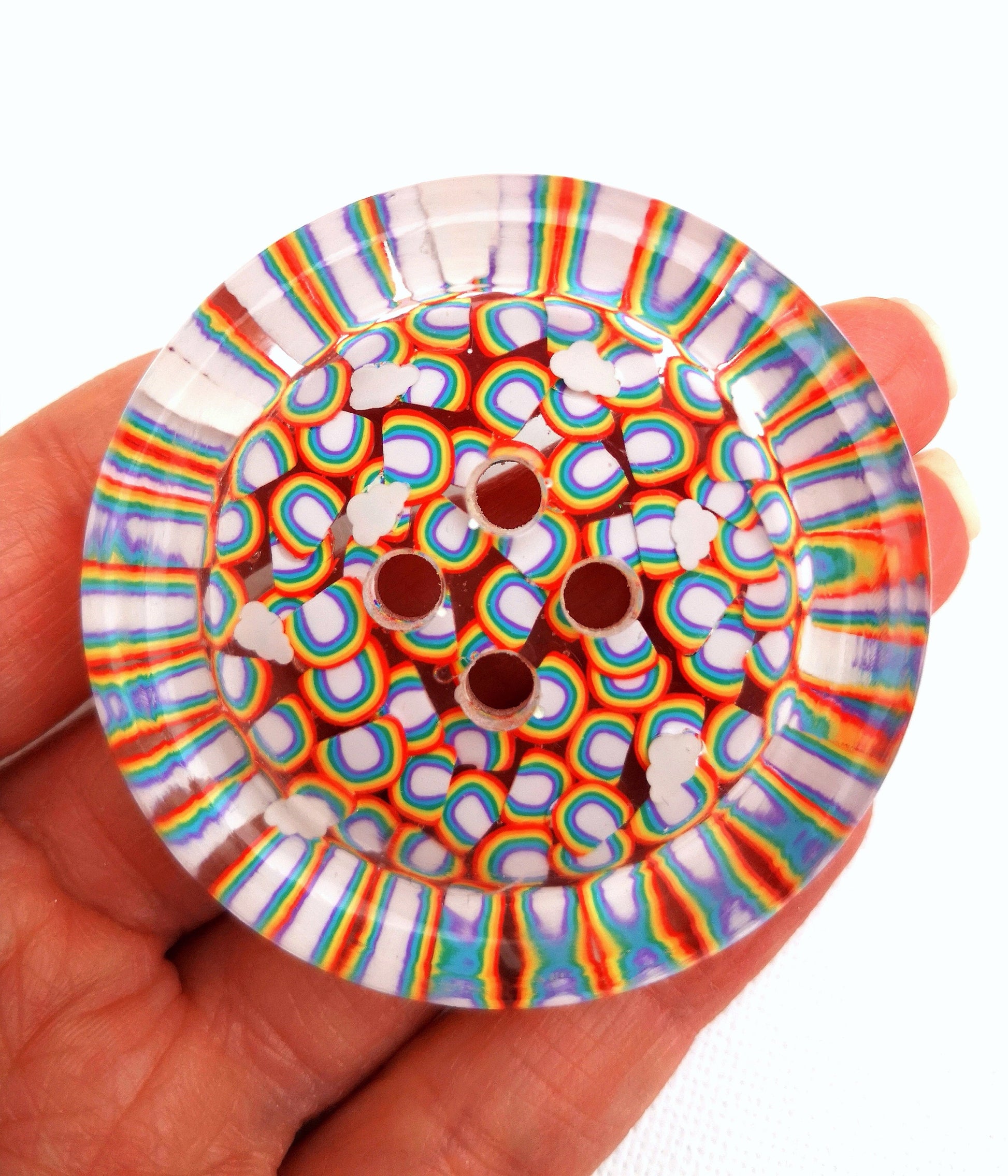 These buttons are true labour-of-love treasures. Each one is a chunky clear resin button filled with a blanket of vibrant rainbows, topped with tiny floating clouds for extra magic. Every rainbow is placed individually by hand, which makes them a little hand-cramping for me but pure happiness for you.
