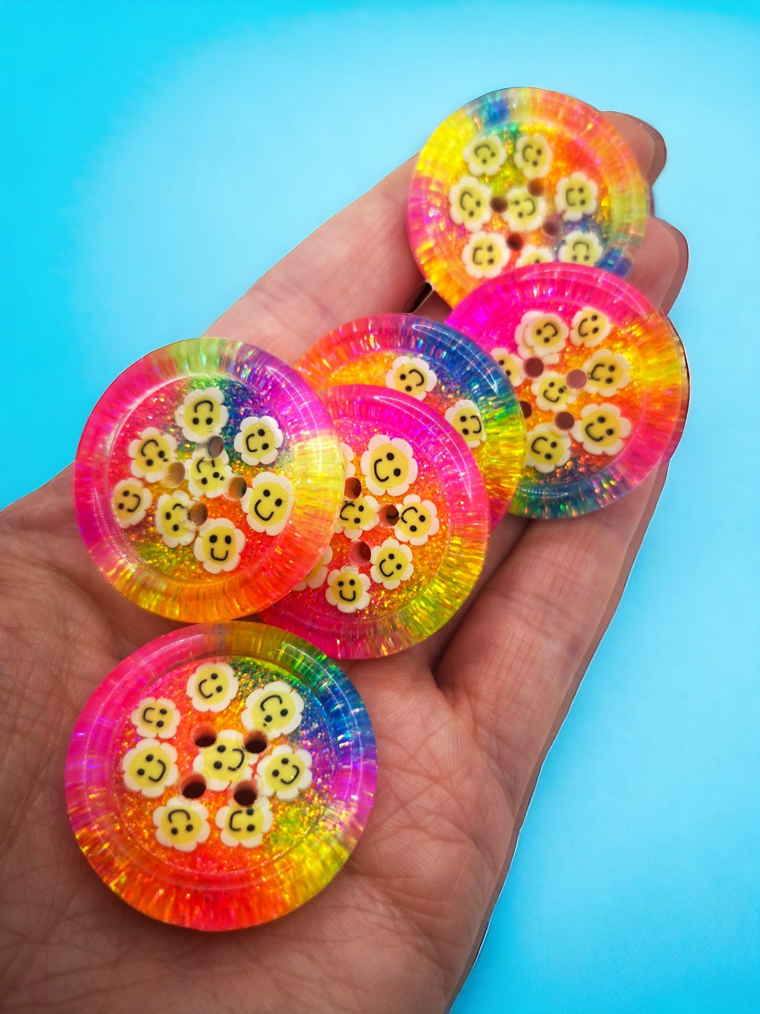 Step straight into the sparkle of the 70s (with a cheeky nod to the 90s) with these chunky disco daisy buttons. Bursting with neon tie-dye style shades and packed with cheerful glitter, they are pure party energy sealed in resin. Each button is a little festival of colour, bold and brilliant with happy flowers that shimmer and shine. Perfect for anyone who loves retro fun, statement style and a touch of nostalgia.