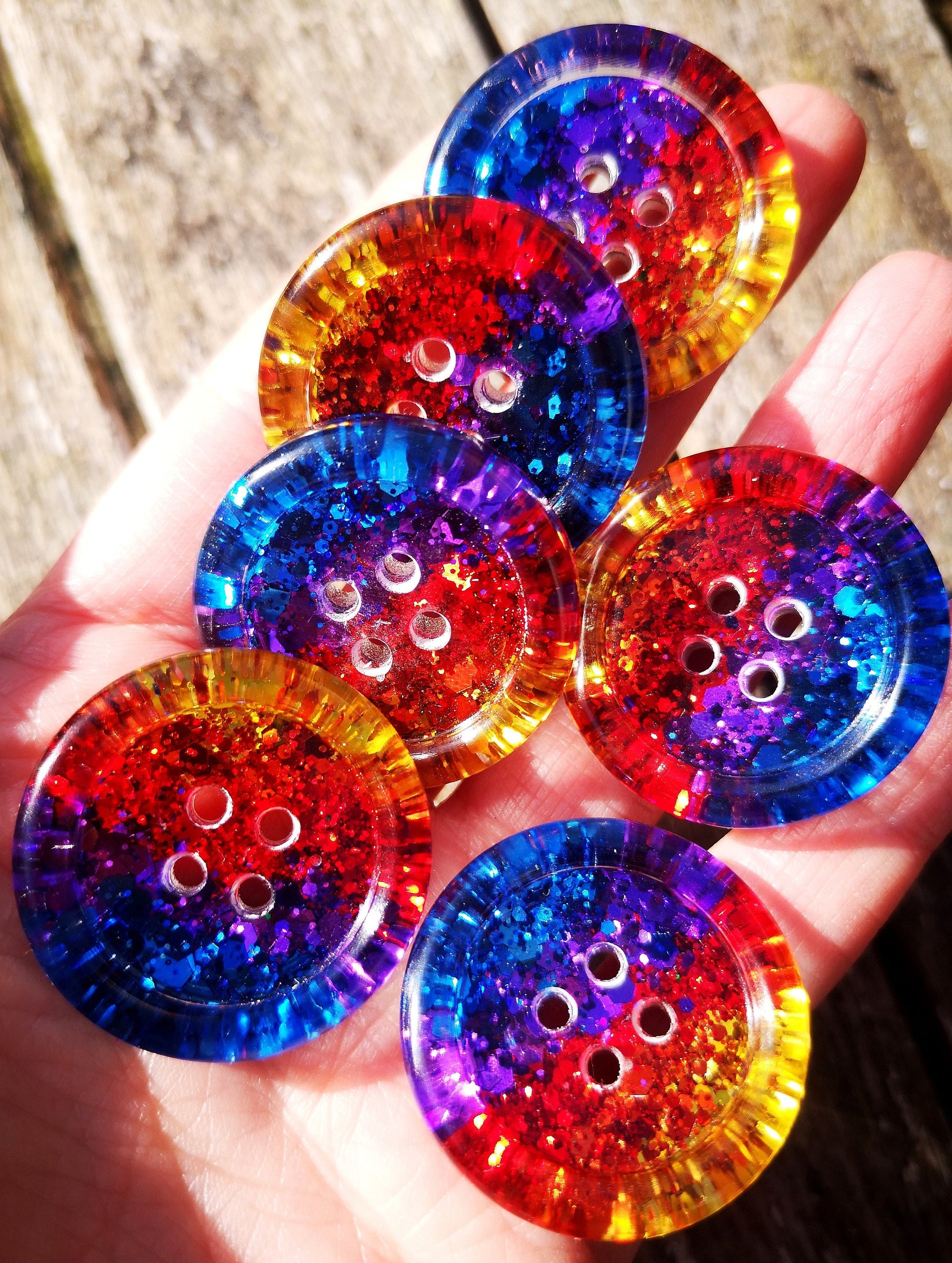 This colour combo is pure joy. Inspired by the bold brilliance of a toucan or the sassiest sunset, these chunky resin buttons shimmer with the sparkliest metallic glitters. Midnight blue melts into deep purple, fiery red, juicy orange and golden yellow, creating a dazzling spectrum that feels tropical and dramatic all at once.Β So bright, so twinkly, so irresistible. Against a black backdrop the colours explode into life, making these buttons a true statement piece for any project.
